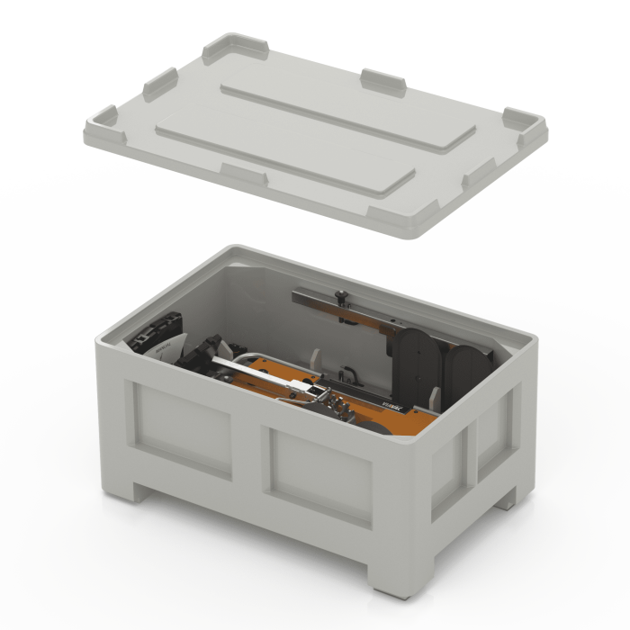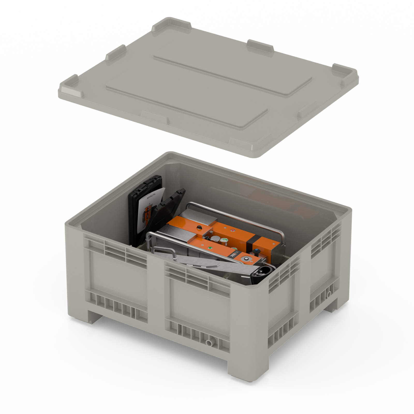 L’avantage de cette caisse de transport est qu’elle offre de l’espace pour l’appareil, deux rallonges, un chargeur, un œillet de levage court et une batterie de rechange. Il y a également de la place pour les documents nécessaires. Tous les éléments ont une place fixe et ne bougent pas pendant le transport. Les dimensions de la caisse sont de 800 mm × 1 200 mm × 580 mm (L×l×H), soit un espace de palette pour le transport standard. De plus, les caisses sont faciles à empiler les unes sur les autres. Grâce à sa fermeture complète, le VIAVAC GBL est bien protégé contre les intempéries et le risque de dommages est ainsi réduit au minimum.