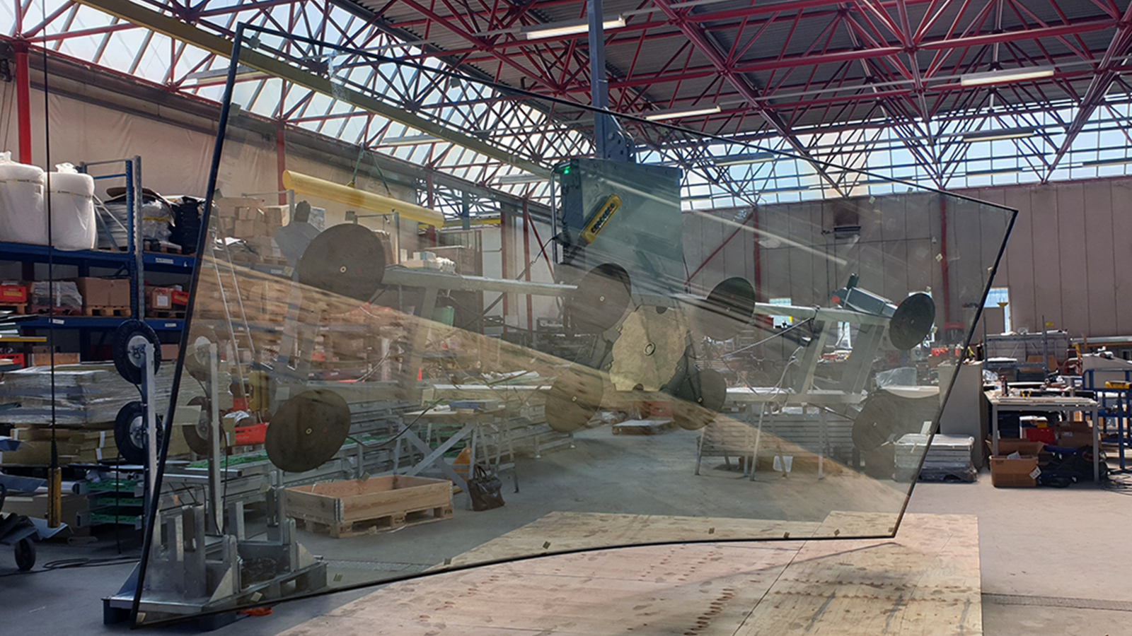 Le VIAVAC GBH a été utilisé pour le levage et le positionnement précis du verre plat, grâce à la fonction de rotation électrique et à la fonction d’inclinaison. Une construction spécialement développée a permis de courber le verre sur place selon le bon rayon. Après que le verre ait été fixé sur la structure, le palonnier à ventouses pour verre a pu être détaché pour l’assemblage du panneau suivant.