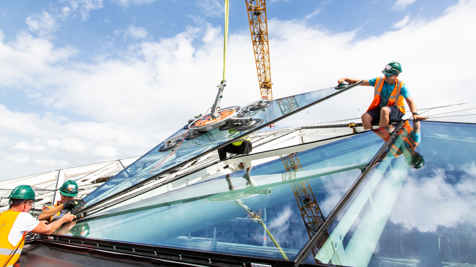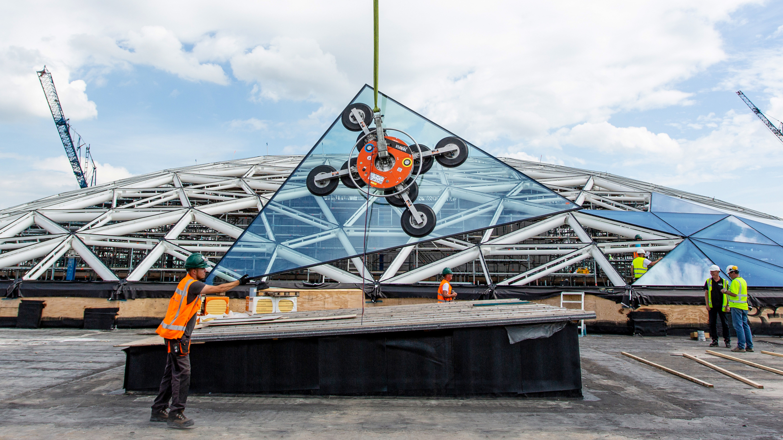 La coupole en verre est composée de 744 éléments en verre, chacun ayant un format différent. La polyvalence du VIAVAC GBX palonnier à ventouses pour verre s’est pleinement exprimée sur ce projet, où précision et puissance étaient essentielles. Pour réaliser l’assemblage complexe, trois grues ont été utilisées simultanément, chacune équipée d’un palonnier à ventouses pour verre VIAVAC GBX. Cela exigeait une collaboration étroite et une communication claire entre les grutiers et le personnel de montage. La confiance dans la fiabilité des palonniers était essentielle, ce qui explique le choix du palonnier à ventouses pour verre VIAVAC GBX.