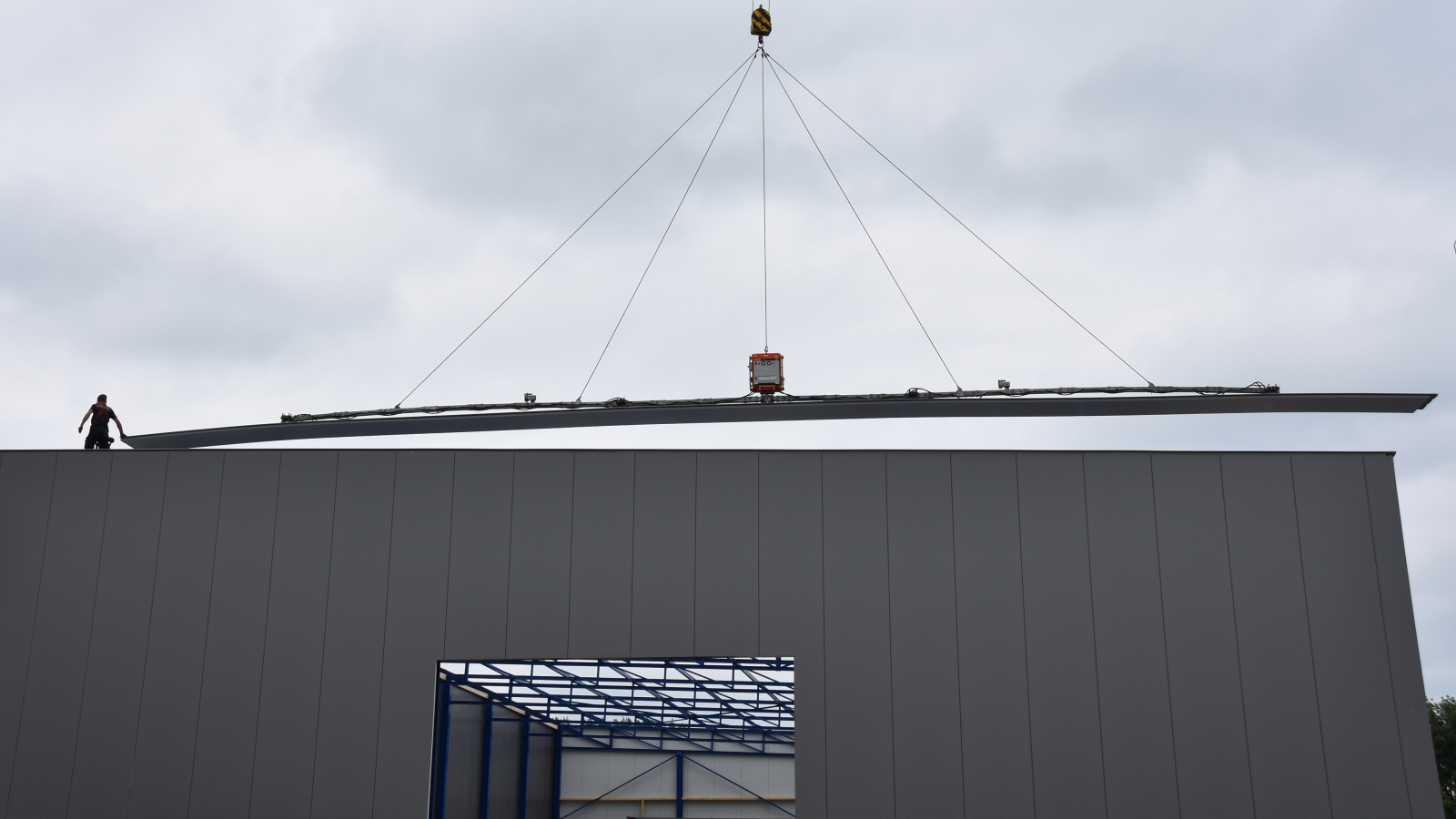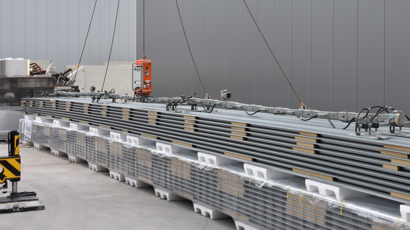 Pour installer les panneaux sandwich de manière efficace et sécurisée, le CladBoy CB5 a été équipé de sa longueur de traverse maximale. À l’aide de ventouses intermédiaires et d’une suspension par chaîne, l’affaissement et l’endommagement des panneaux sont évités. Grâce au double système de vide du CladBoy CB5, l’utilisation de sangles de sécurité antichute supplémentaires n’est pas nécessaire. Cela réduit au minimum le nombre de manipulations nécessaires pour soulever les panneaux et les positionner sur la structure de toiture. Cela permet un gain de temps considérable, en particulier lorsque les panneaux sont longs, comme dans ce projet.