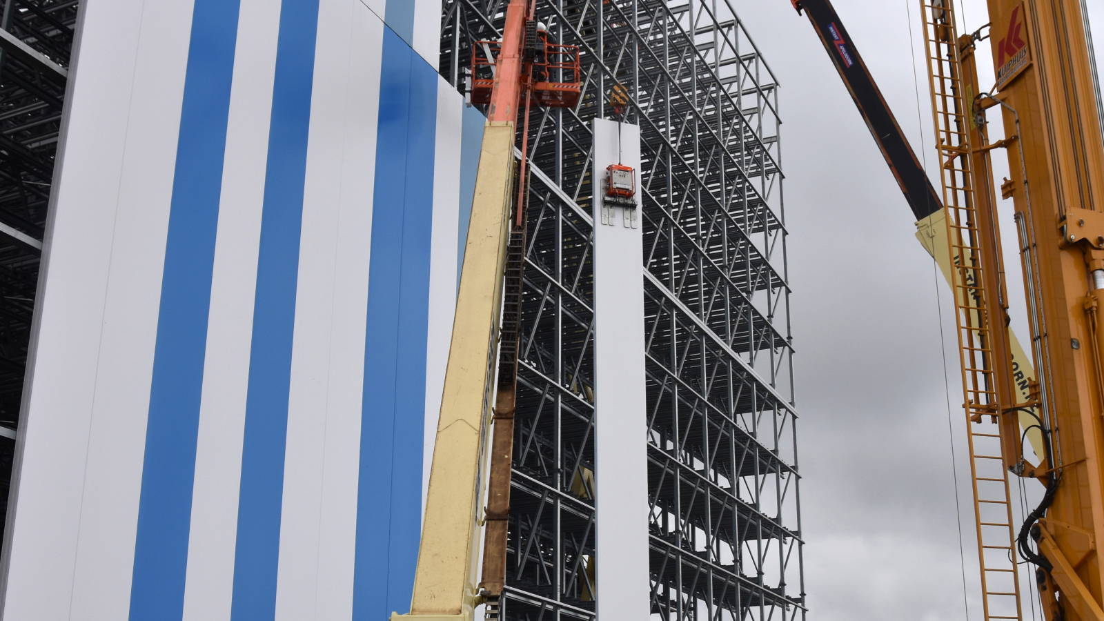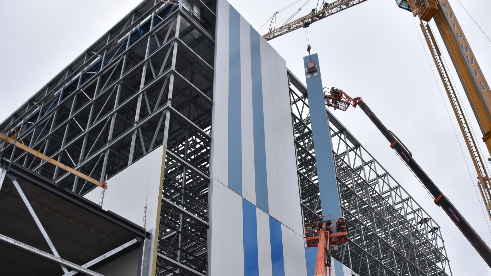 KIM Nederland, leader du marché dans la réalisation de bâtiments à température contrôlée, utilise pour tous ses travaux de montage les palonniers de VIAVAC. Cela vaut également pour l’assemblage de panneaux de bardage de dix-huit mètres de long destinés à la nouvelle installation de stockage frigorifique et de congélation de Coenen Boxmeer à Haps. Ce bâtiment impressionnant a une hauteur de pas moins de 35 mètres et offre un espace pour 27 500 emplacements de palettes, dont 3 500 emplacements de palettes réfrigérées et 24 000 emplacements de palettes pour les produits surgelés. Pour l’enveloppe isolante du bâtiment, des panneaux sandwich avec un noyau isolant Quadcore ont été sélectionnés.