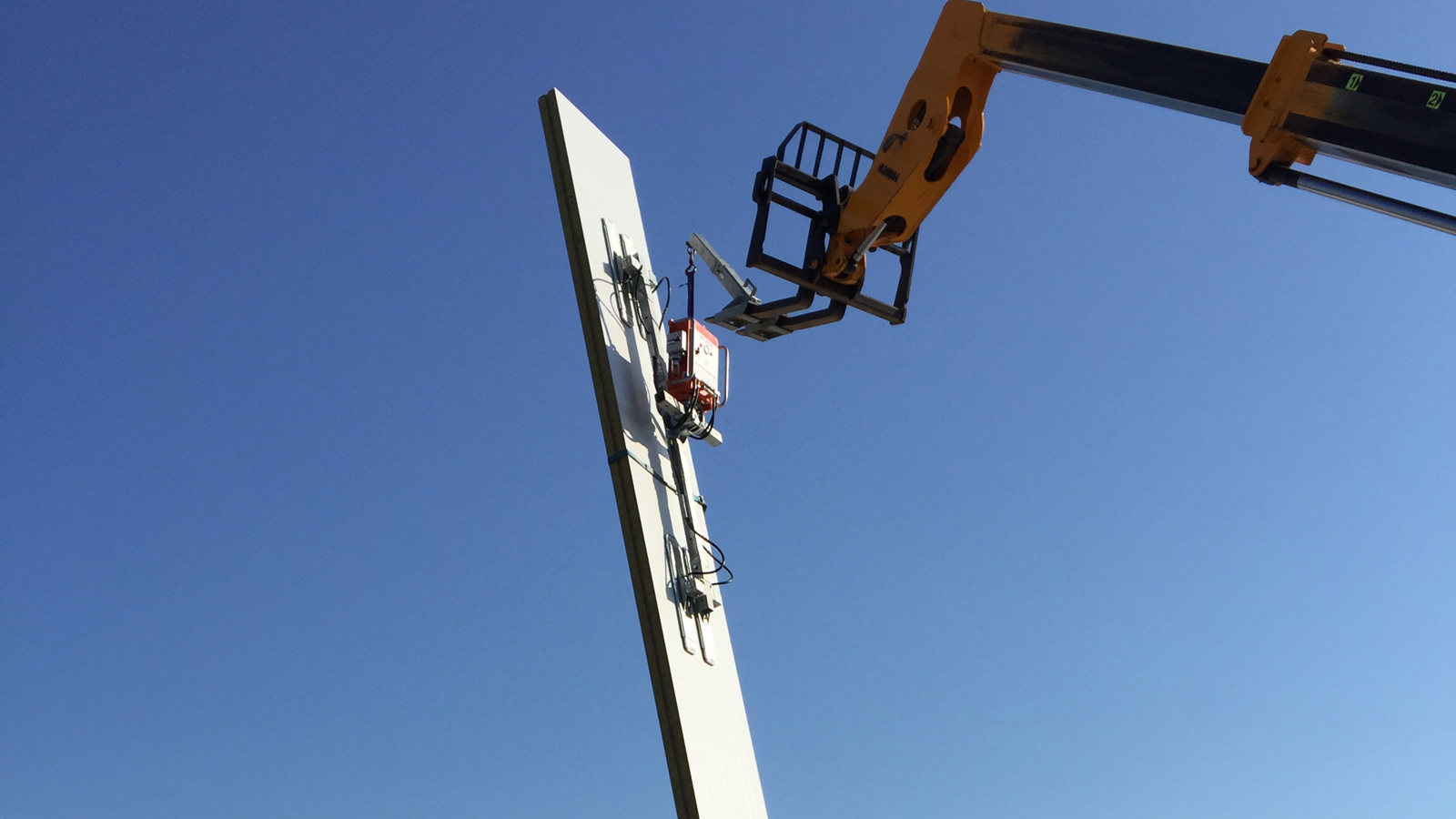 Pour l’installation des panneaux, le CladBoy CB5 a été utilisé. Des ventouses spéciales avec une capacité de levage accrue ont été utilisées en raison du poids des panneaux. Le CladBoy CB5 est doté d’un système de vide double, ce qui rend l’utilisation de sangles antichute supplémentaires inutile. Grâce à la télécommande radio, le palonnier pouvait être détaché à distance du panneau. En raison de l’espace limité disponible, le découplage manuel n’était pas possible et l’utilisation de la télécommande a permis de gagner du temps lors du montage.
