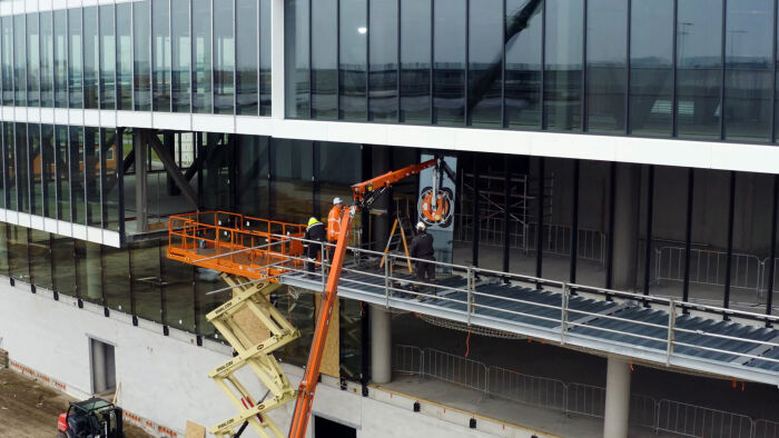 L’assemblage du verre triple feuilleté a constitué une étape essentielle du processus de construction. Pour cela, deux palonniers à ventouses pour verre VIAVAC GBX ont été utilisés. La conception modulaire de ces palonniers à ventouses pour verre les rend particulièrement flexibles, ce qui permet de les adapter facilement aux différents formats de vitrage utilisés dans le bâtiment. Cela a permis un assemblage efficace et sécurisé, malgré la variation des dimensions des panneaux de verre.