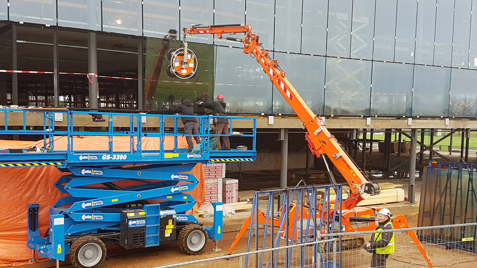 FB Gevelmontage utilise principalement ses propres grues compactes pour l’assemblage du verre. Ces mini-grues sont particulièrement adaptées aux travaux en milieu urbain et dans des espaces restreints, où l’espace est limité. Le VIAVAC GBX est le palonnier à ventouses pour verre idéal à associer à ces mini-grues. Grâce à la grande capacité de levage et au faible poids propre du VIAVAC GBX, le vitrage peut être installé en toute sécurité et efficacité sans risquer de surcharger les grues.