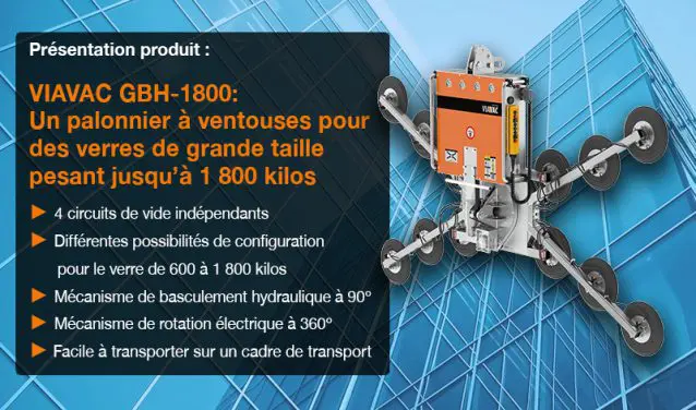 En ce début de nouvelle année, VIAVAC (fabricant et fournisseur de matériel de palonniers à ventouses) lance sur le marché un nouveau palonnier à ventouses pour verre : le VIAVAC GBH-1800. Avec ce palonnier à ventouses « Jumbo », VIAVAC élargit encore sa gamme pour le verre, grâce à laquelle l’entreprise est en mesure d’offrir une solution de levage adaptée à chaque type de verre.