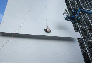 Cet appareil de levage robuste et solide est bien adapté à l’assemblage de bardages en intérieur ou sous un surplomb. À cette fin, le CladBoy compact est souvent utilisé avec le CraneArm. Avec la combinaison du CladBoy compact, du chariot élévateur ou du chariot télescopique et du CraneArm, l’assemblage des panneaux est un jeu d’enfant.