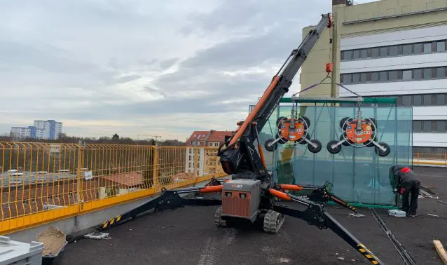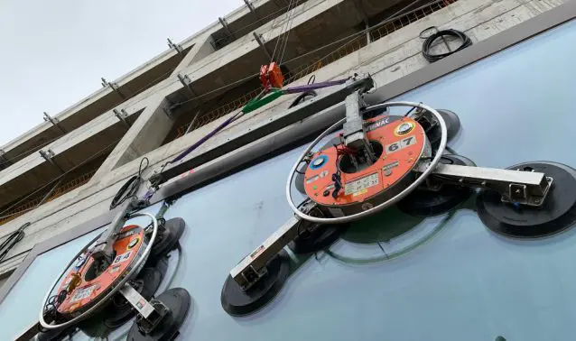Pour ce projet, on a utilisé des ventouses, spécialement développées pour le montage de bardage, qui peuvent soulever 250 kg par ventouse. Avec le double circuit de vide dont est équipé le CladBoy CB5, cela revient à une capacité de levage de 500 kg. L’avantage d’un double circuit sous vide est que l’utilisation de sangles anti-chute n’est pas nécessaire. Le deuxième circuit sert de sauvegarde. En outre, il accélère le processus de montage, ce qui permet de réaliser des économies en termes de coûts de personnel.