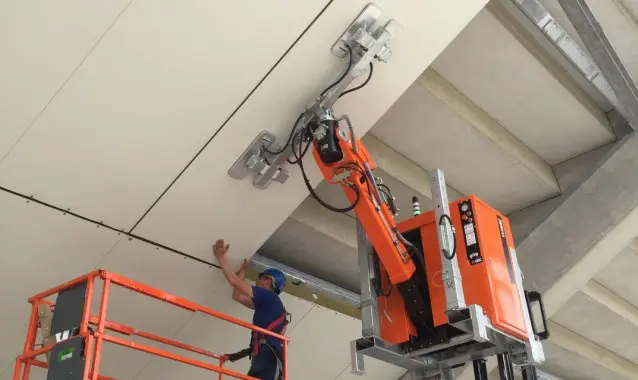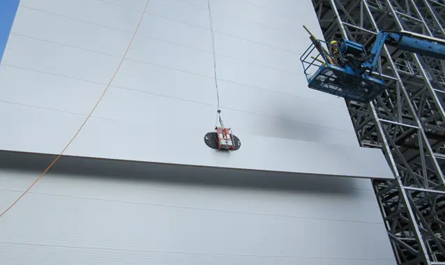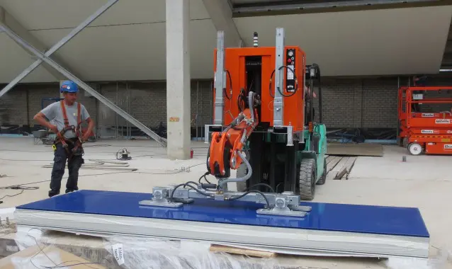 De nieuwe CladMaster werd met succes ingezet bij werkzaamheden aan stadion de Geusselt in Maastricht. Kempen Cladding huurde deze vacuümheffer om sandwichpanelen met een steenwol isolatiekern tegen de onderkant van de tribune te monteren.