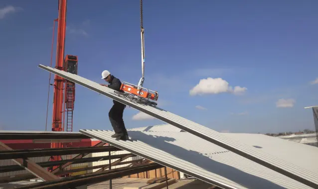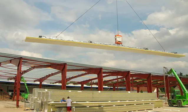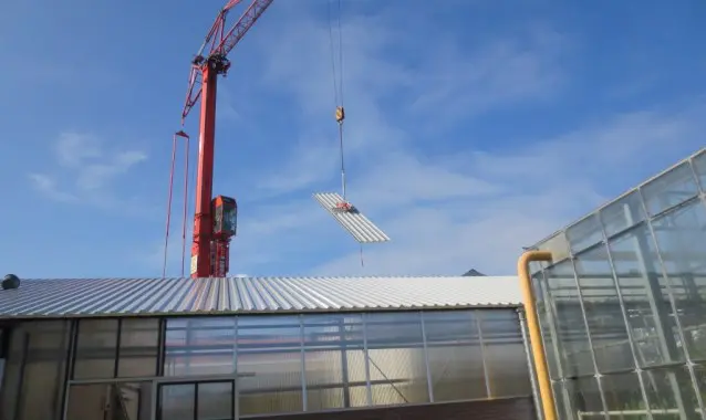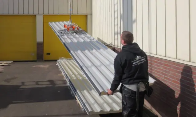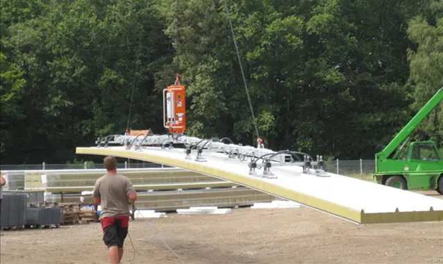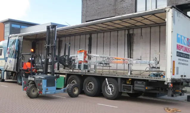 Voor deze klus is de CladMaster uitermate geschikt; geplaatst op een heftruck kunnen de panelen op een efficiënte en veilige wijze getransporteerd én gemonteerd worden.