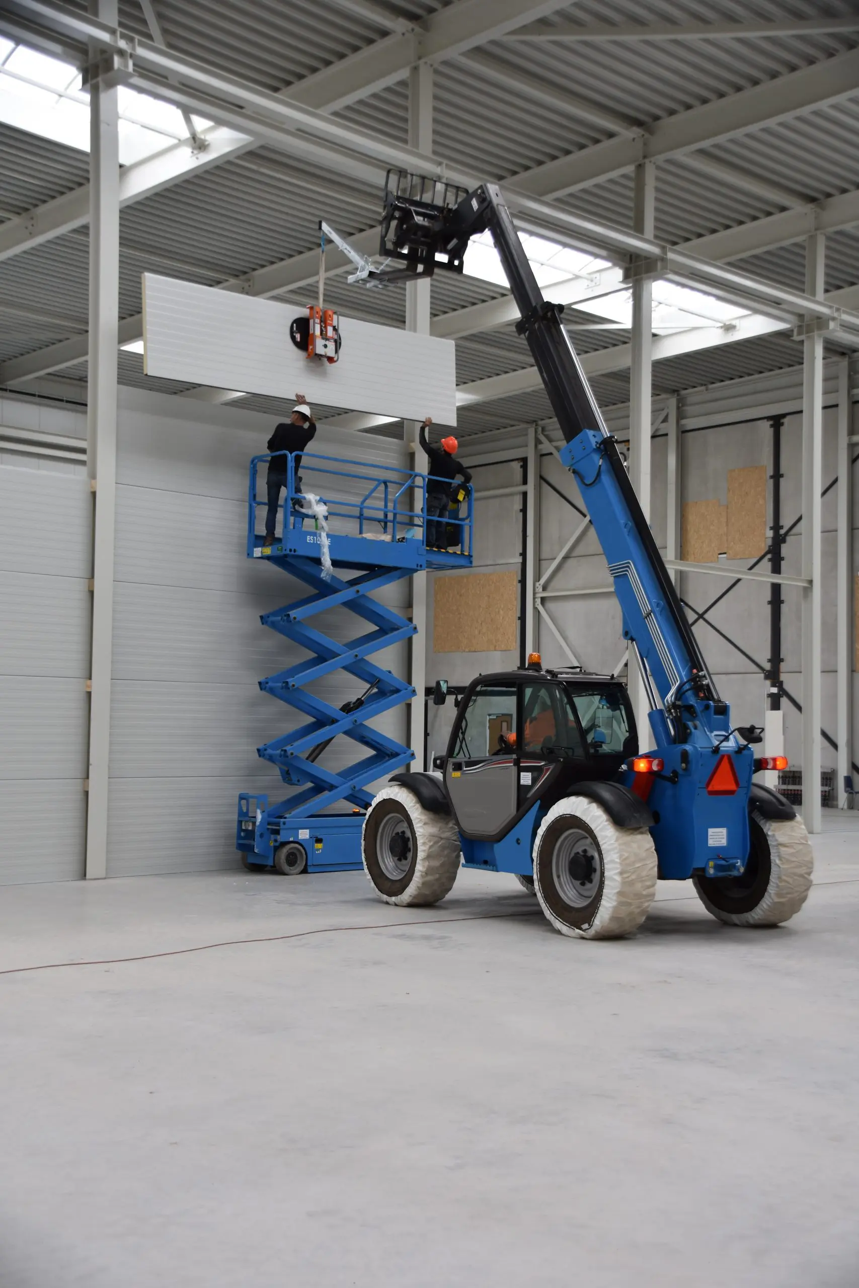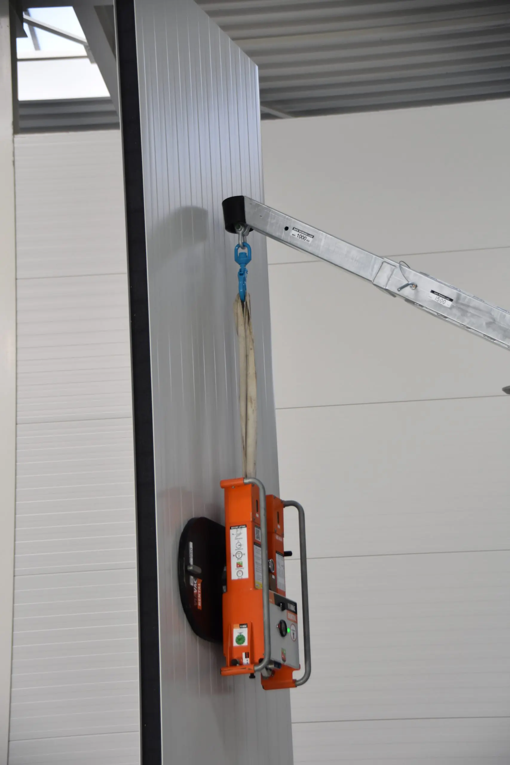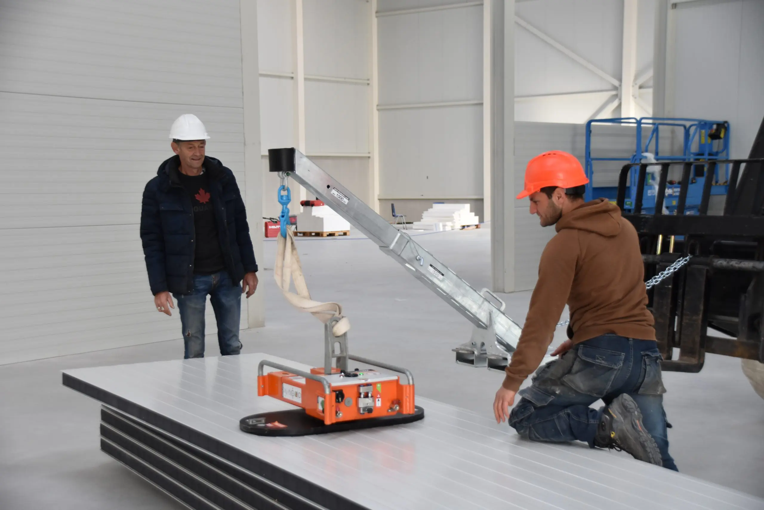 Door het gebruik van de CladBoy compact in combinatie met een heftruck waarop de VIAVAC CraneArm is gemonteerd, wordt het plaatsen van zware panelen een fluitje van een cent.